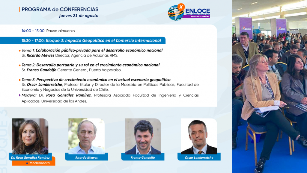 En la sesión de la tarde, el foco se desplazará hacia los desafíos económicos y geopolíticos que enfrentan los puertos en el contexto actual. Este bloque será moderado por la Dra. Rosa González Ramírez, Profesora Asociada de la Facultad de Ingeniería y Ciencias Aplicadas de la Universidad de los Andes, y contará con tres ponencias clave: